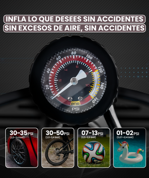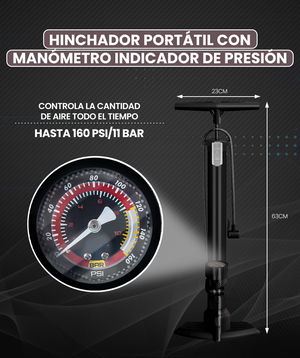 Preoccupato per la pressione giusta? La nostra pompa include un manometro di alta precisione che ti permette di monitorare in tempo reale e regolare la pressione fino a un massimo di 160 PSI/11 Bar. Niente più brutte sorprese durante il gonfiaggio.