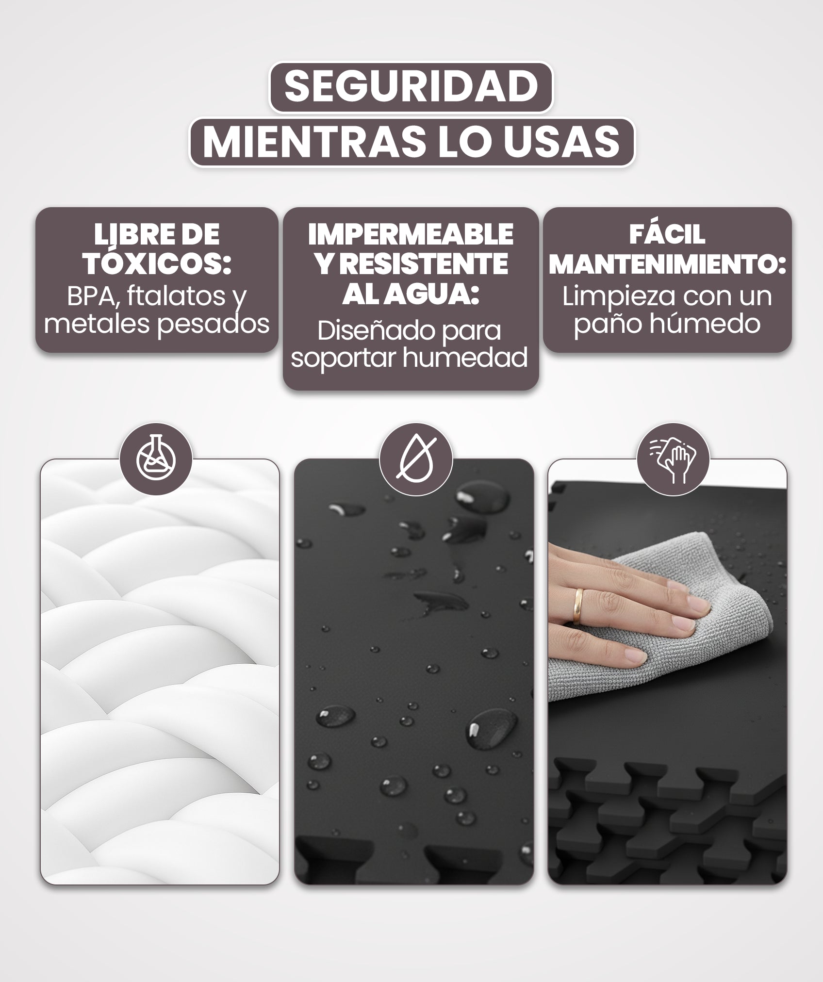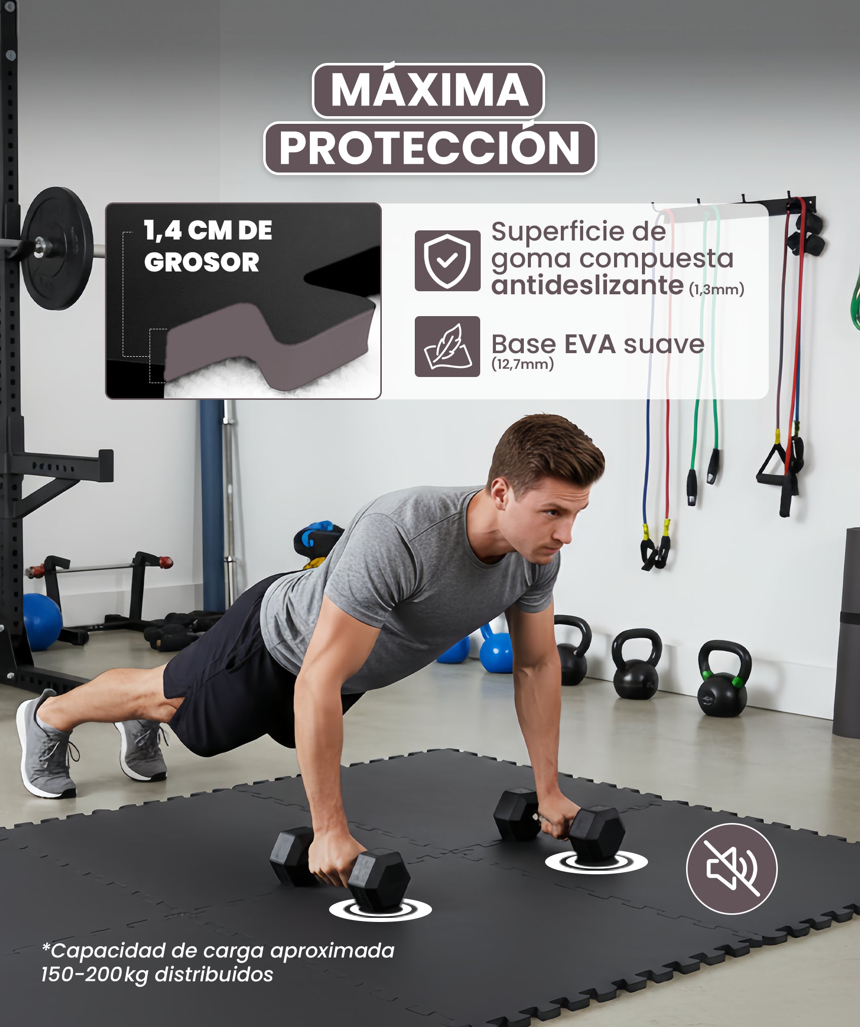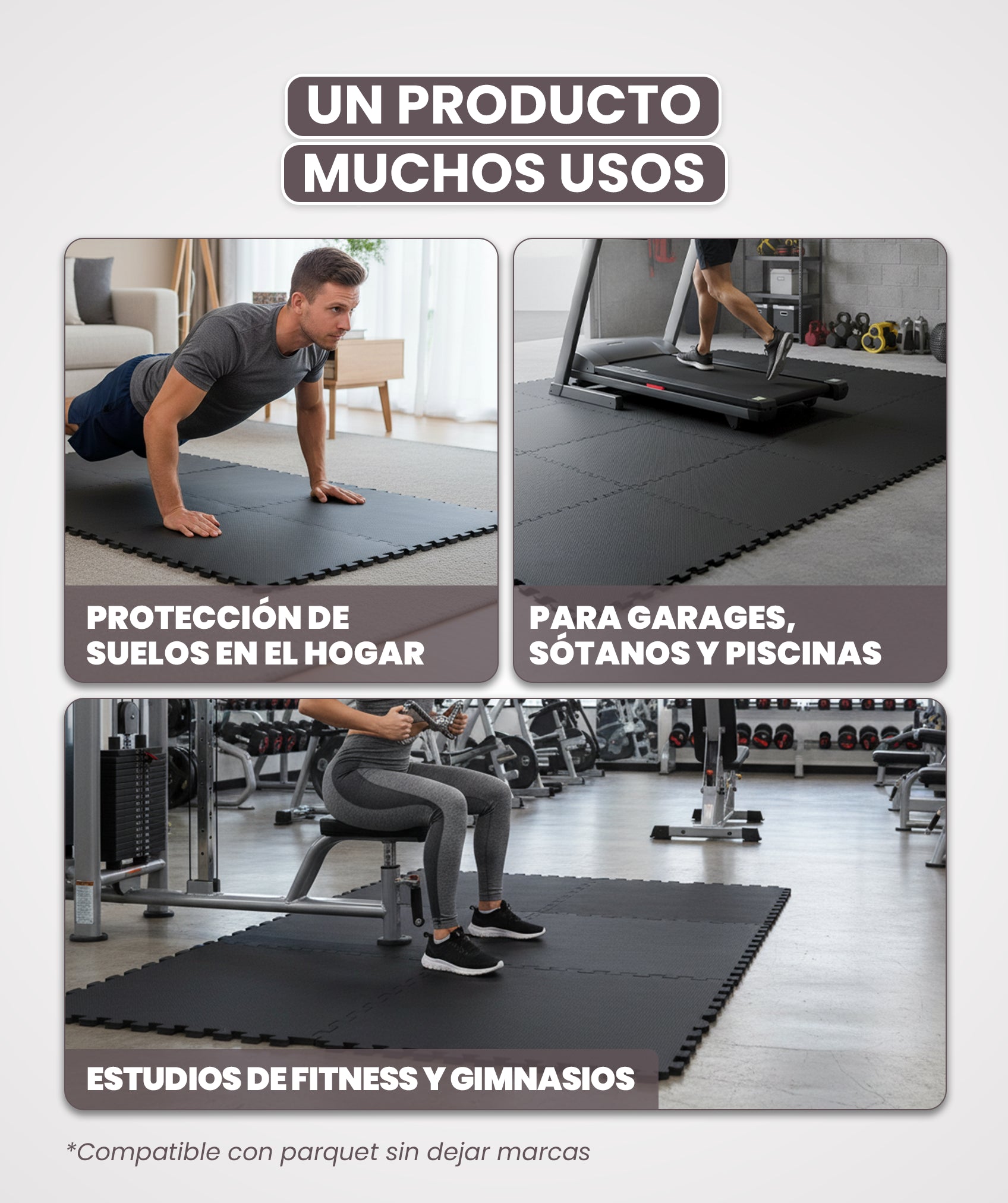 Tapetes tipo puzzle de espuma EVA con gran amortiguación, antideslizantes y fáciles de armar. Aíslan del calor y el ruido, brindan seguridad y comodidad. Ideales para gimnasio, juegos, yoga, pilates y entrenamientos en casa. Impermeables y fáciles de limpiar.