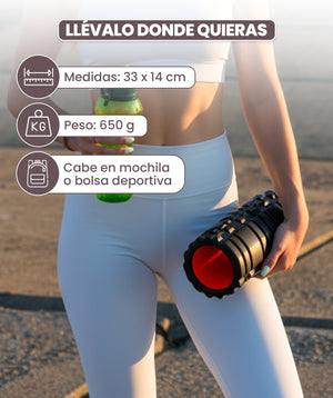 Equipo de automasaje que puede ser utilizado en la casa, el gimnasio, el parque o cualquier espacio que sea de tu preferencia. Su tamaño compacto (33 x 14 cm), peso reducido (0,65 kg) y comodidad de transporte lo transforman en el acompañante predilecto de ejercitación.