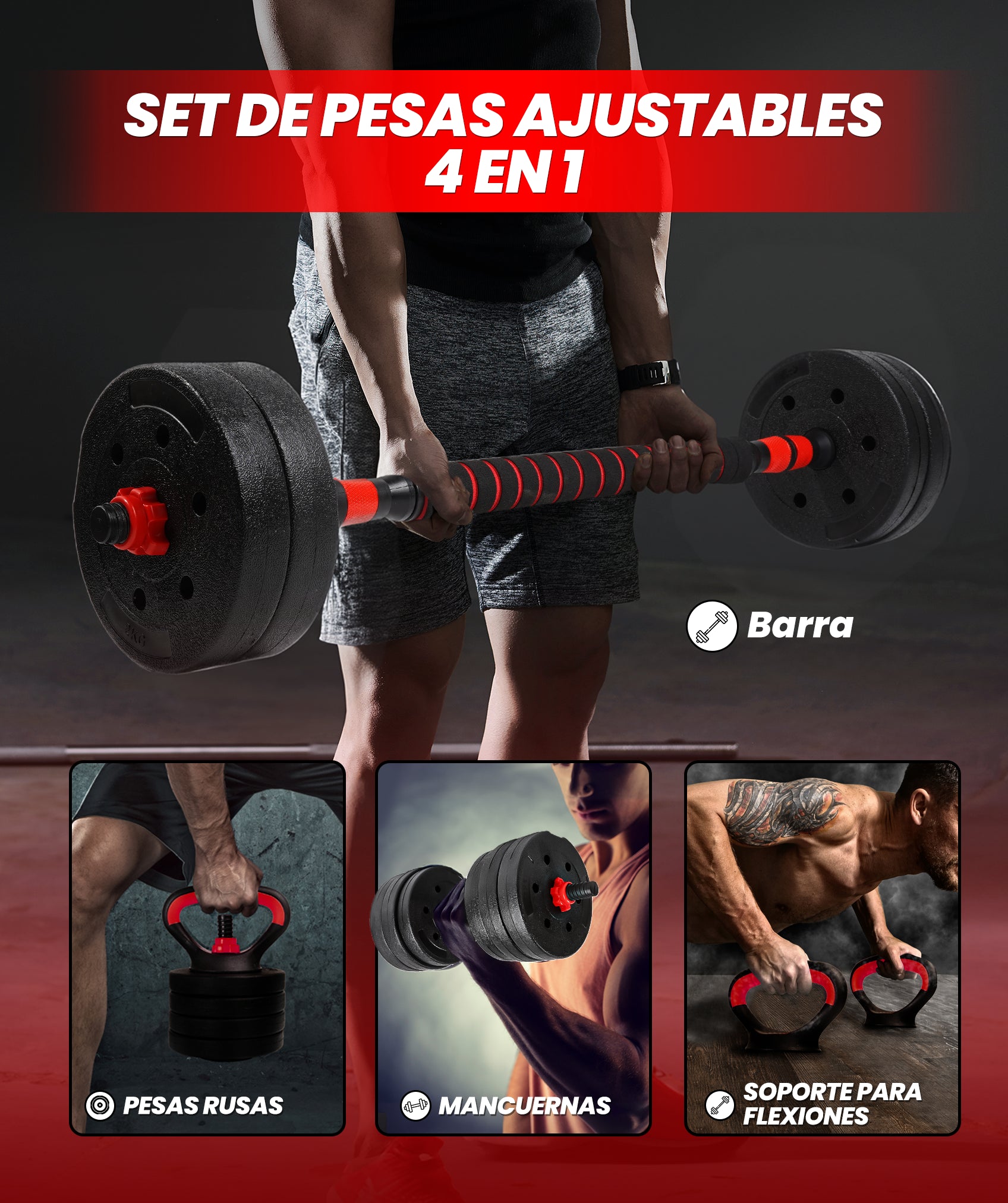 Set di manubri regolabili Red Transformer con Kettlebell (10-40kg)